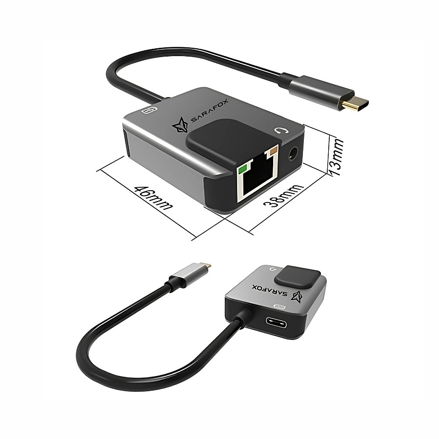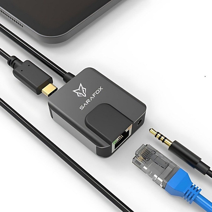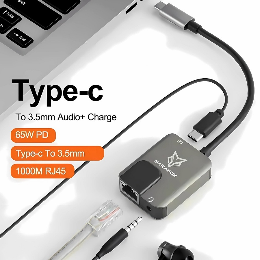محول سارافوكس 3 في 1 ، متوافق مع معظم الأجهزة ، يحتوي على مقبس سماعة رأس مقاس 3.5 ملم ، ومنفذ شحن من النوع C بقوة 65 وات ، ومنفذ كابل إيثرنت يدعم سرعة إنترنت تصل إلى 1000 ميجابت في الثانية ، ومناسب للألعاب والاستخدامات الأخرى.