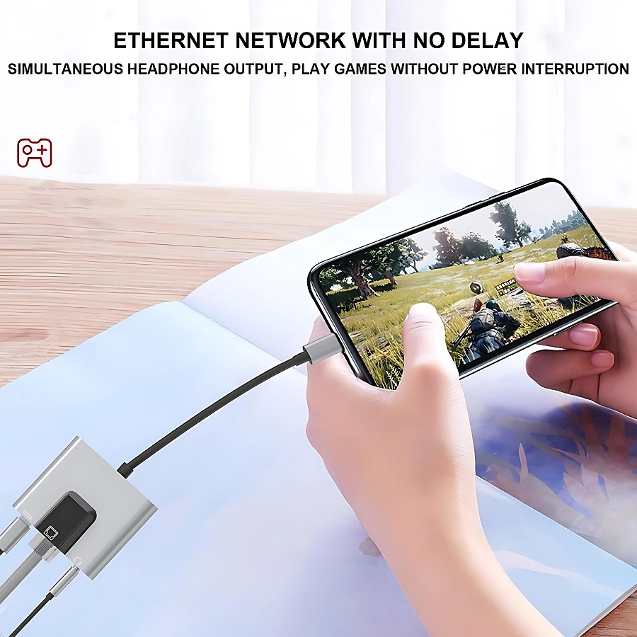 3 in 1 adapter for iPhone with Lightning port, contains a 3.5mm headphone jack, a charging port, and an Ethernet cable port. Suitable for gaming or normal use. You can operate the headphone, connect to the Internet, and charge your phone at the same time.