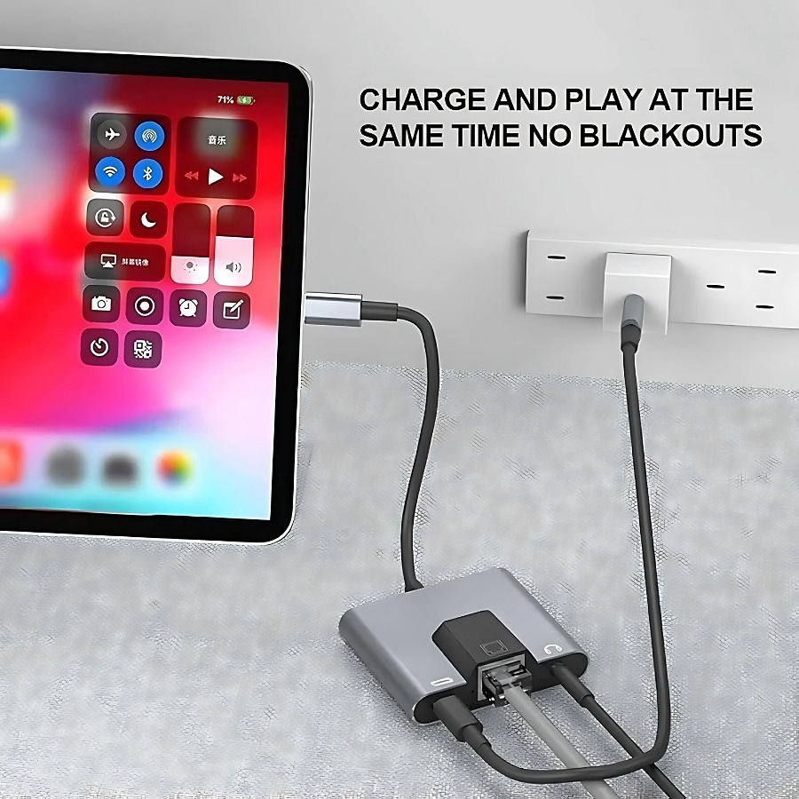 •3-in-1 Multifunction Adapter: This multifunctional adapter allows you to connect to the Internet via Ethernet while providing audio output via a 3.5mm headphone jack. It also has a USB-C socket for charging lightning enabled devices.