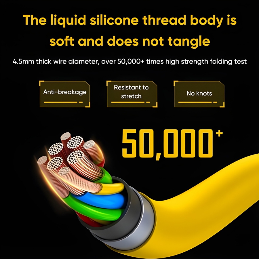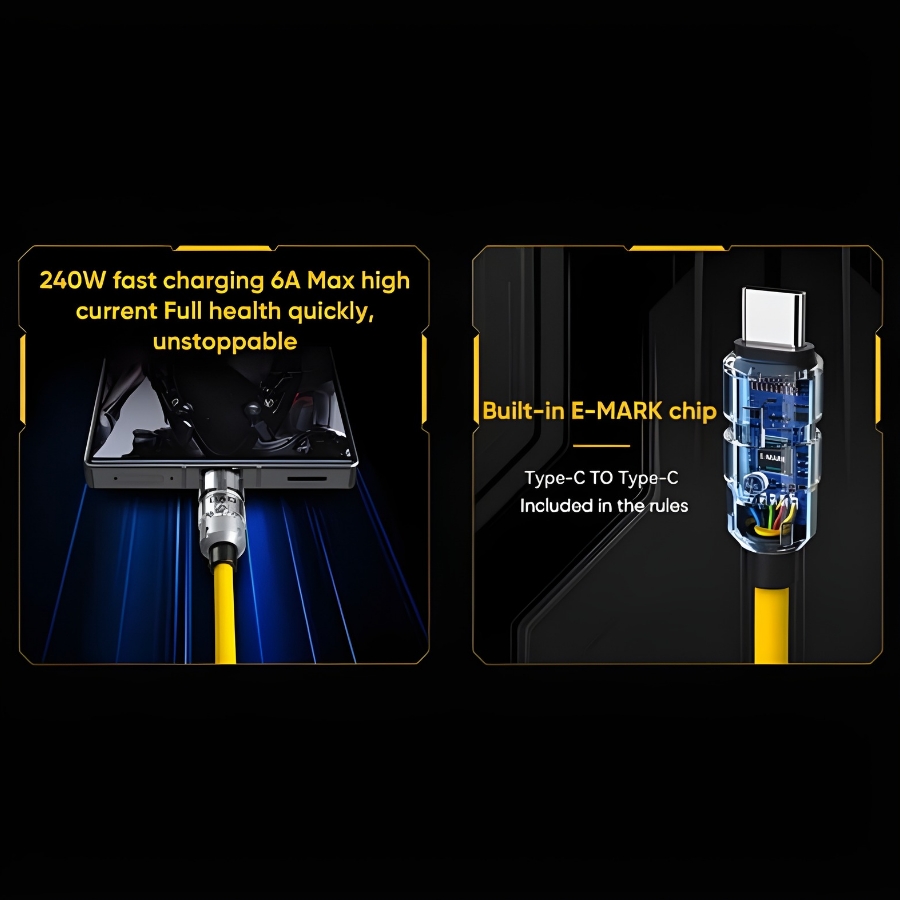 •The cable features a built-in smart E-MARK chip, providing intelligent power regulation to ensure safe and optimal power distribution between the device and charger. Made of high-quality silicone, giving it a soft touch with tangle resistance. With a wire thickness of 4.5mm, making it durable and capable of withstanding heavy use.