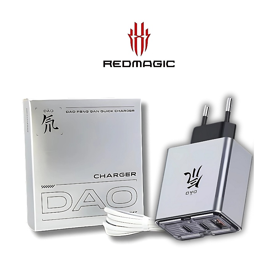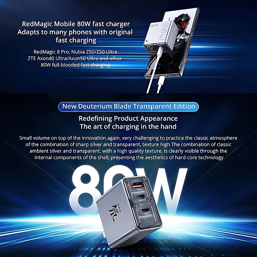 Nubia RedMagic Multi-use Wall Charger, with GAN technology to ensure fast, smooth and safe charging, contains 3 inputs, two 80W Type-C inputs and a 22.5W USB input, compatible with phones, tablets and laptops and supports all charging protocols, comes with the special cable