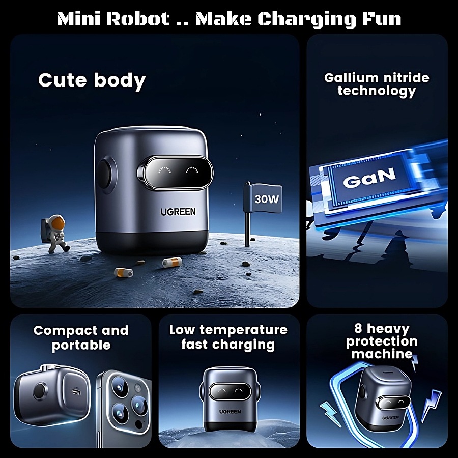 UGREEN 30W Robot Charger with Interactive Display When Charging and When Charging is Complete, GAN Technology for Safe and Smooth Charging, Comes with Type-C Port, Small Size and Easy to Carry, Supports Most Charging Protocols, Compatible with Phones, Tablets, Headphones and MacBook.