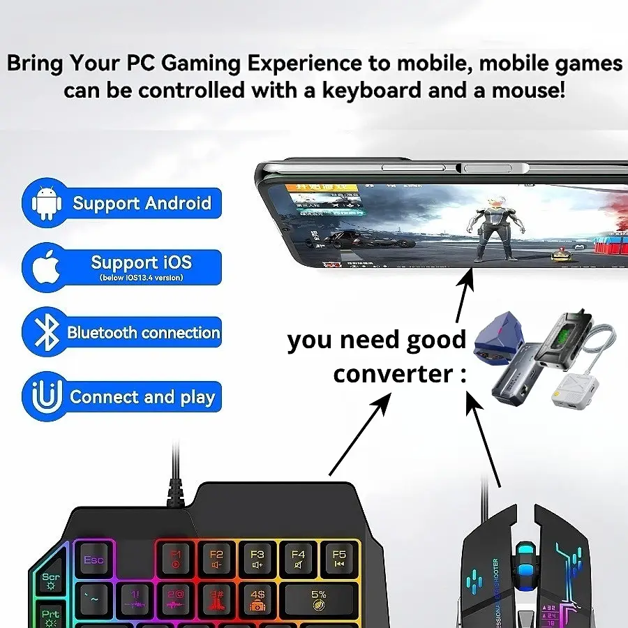 •INCLUDED: 4 in 1 mobile game combo includes a gaming mouse, a one handed K13 keyboard, adjustable phone stand with multi position angle adjustment, and mouse pad.