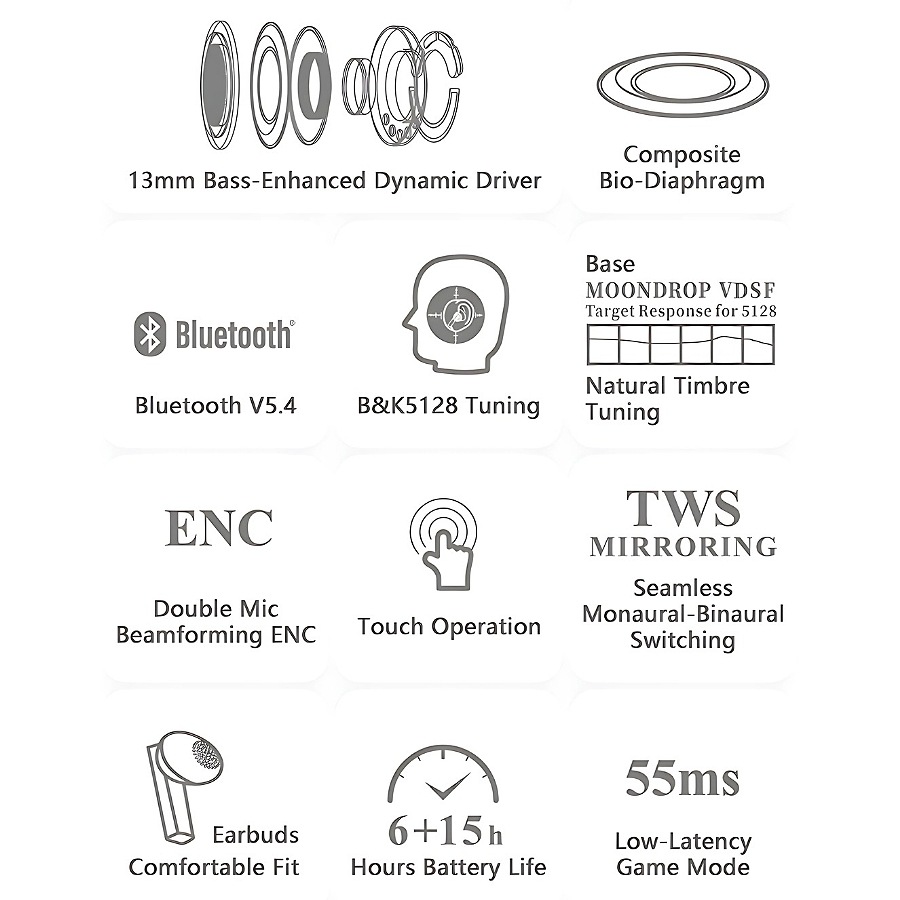 Moondrop wireless earbuds, designed for calls and listening, with a high isolation ratio, pure and clear sound with the ability to control through the application, control modes, large battery capacity and light weight, Bluetooth 5.4, with noise isolation feature