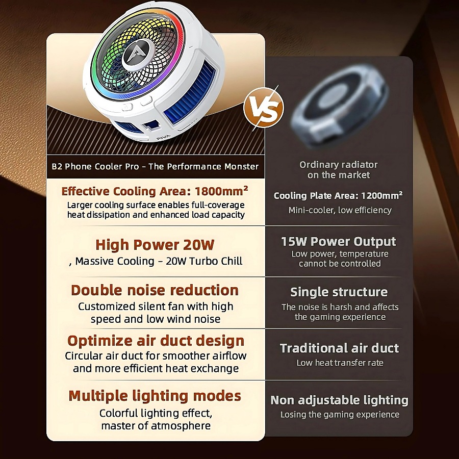 •compatible with all devices (ios&android)•Excellent and instant cooling, stable performance, 20W cooling power, optimized design, and conductive aluminum radiators are some of the reasons that make this cooler one of the best choices.