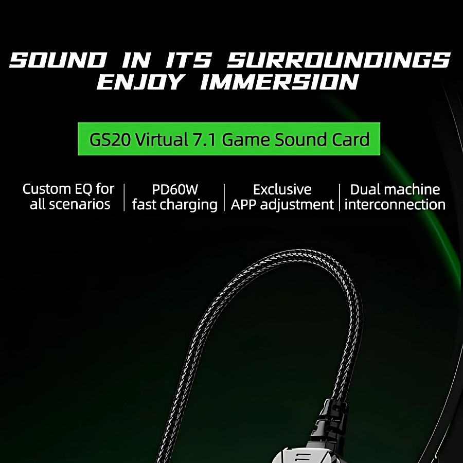 A sound card adapter specifically designed to enhance your audio experience. It transforms any headset into a professional 7.1 surround sound, compatible with mobile phones, tablets, iPads, laptops, and computers. It supports 60W fast charging and includes two 3.5mm and Type-C ports, in addition to a Type-A converter.