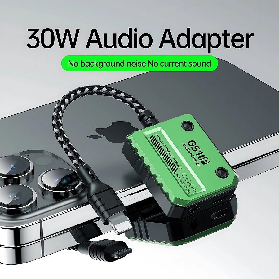 GS1 IP Audio+Charge 30W Fast Charge Headphone Connector 3-in-1 Mobile Phone Sound Card Charging Adapter for iPhone X, 12, 13, 14, Pro Max. This fabric cable adapter is designed for Apple devices, providing a seamless lightning connection for audio and charging. It’s a versatile solution for mobile accessories, offering high-speed charging and audio capabilities in one compact device.