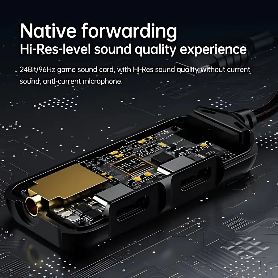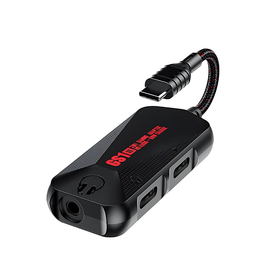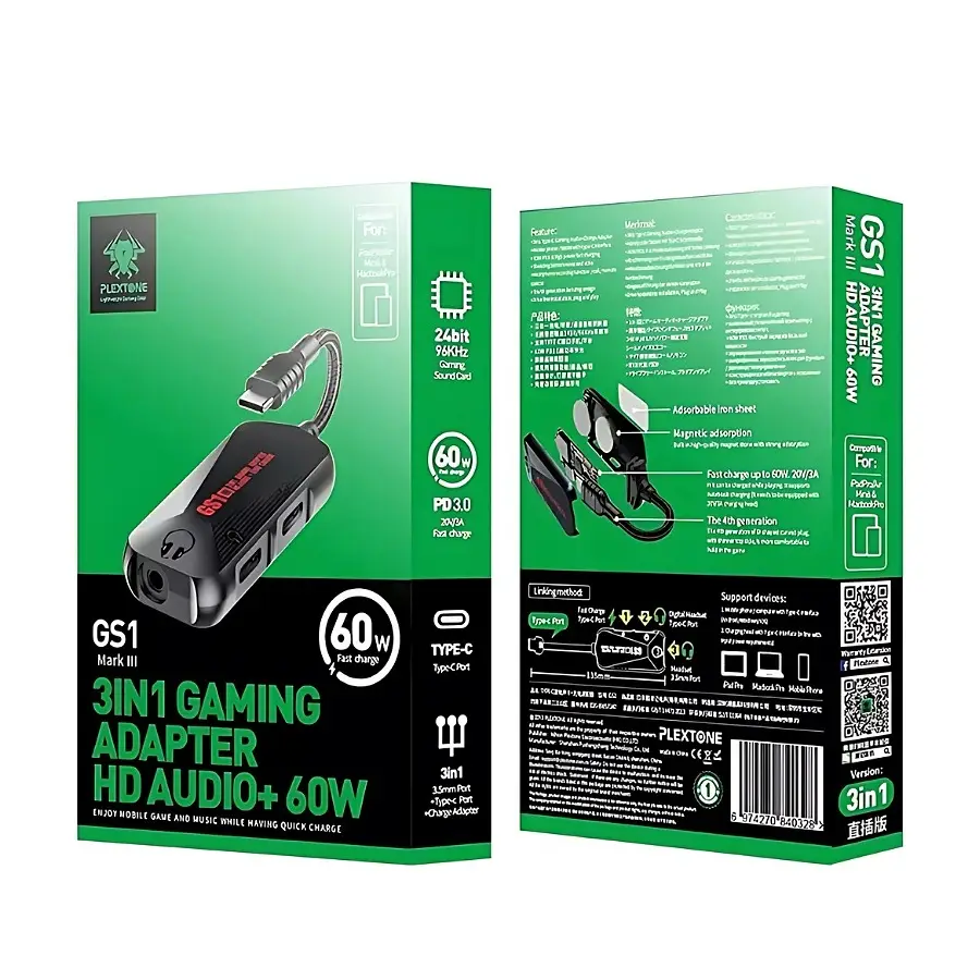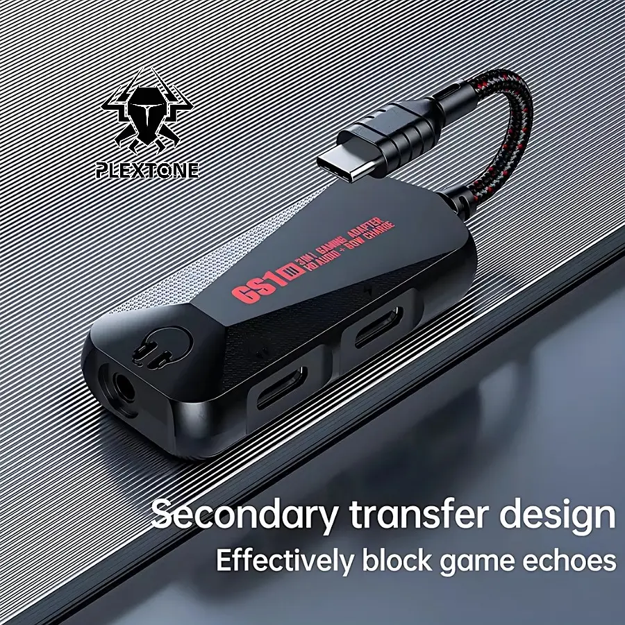 Plextone 3 in 1 adapter, 60W Type-C charging port, 3.5mm headphone jack, and Type-C port for headphones or any external accessory, lightweight and easy to carry, compatible with most devices, suitable for normal use or gaming, offers a range of sound enhancements, and the ability to use all ports at the same time.