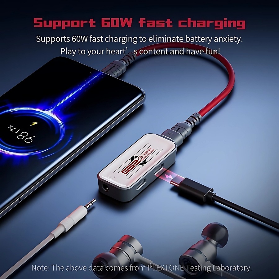 Plextone 3 in 1 adapter, 60W charging port, 3.5mm headphone jack, and Type-C headphone jack, with two cables of different lengths for flexible use, attachable and removable, suitable for gaming or normal use, compatible with most devices.