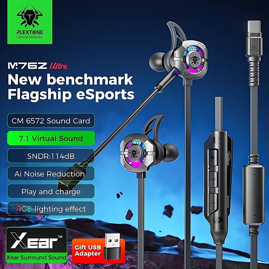 Plextone Wired earphone, Type-C Port, Suitable for Gaming and Listening, Pure and Clear Sound, Comfortable to Wear, Supports Multiple Surround Sound Modes, Compatible with Phones, Computers, Tablets, Laptops and PlayStations, Supports 7.1 Surround Sound, Supports Charging While Playing with a 40W Charging Port