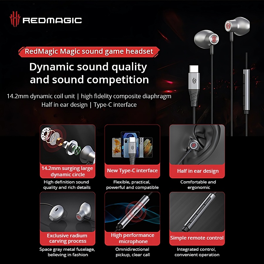 Redmagic wired earphone, comfortable metal design, suitable for gaming and listening, provides clear sound and precise positioning, compatible with all Redmagic devices and most other devices.