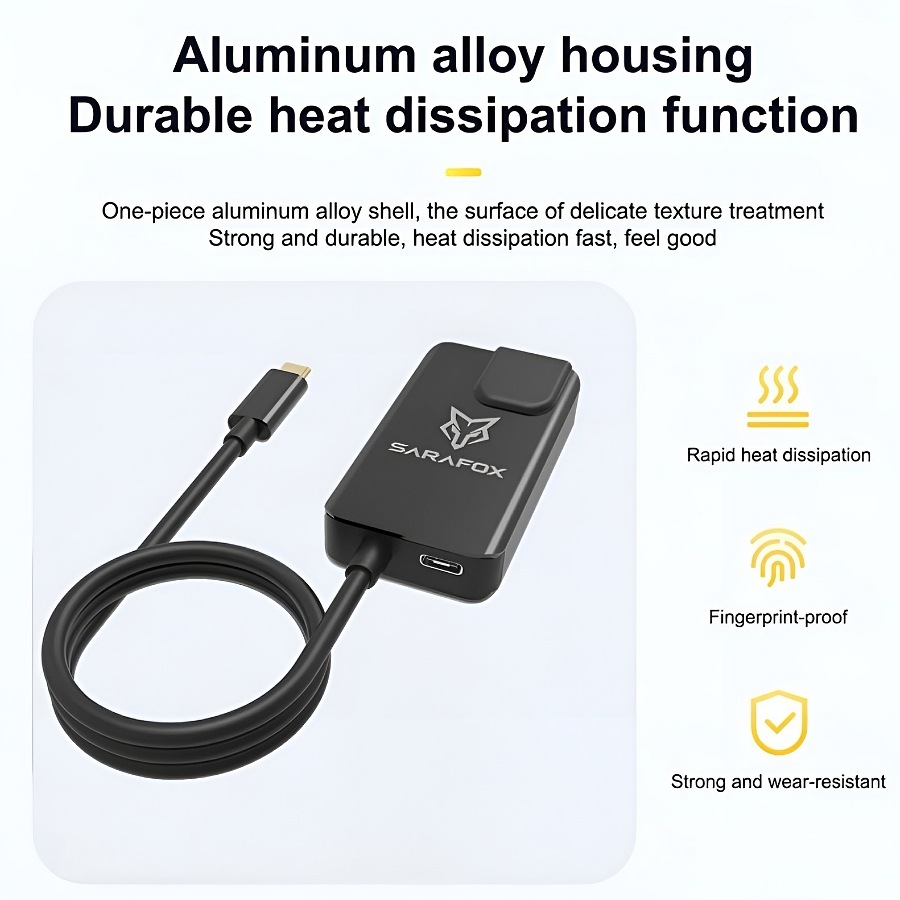 Sarafox 5 in 1 adapter, compatible with most devices, contains a 3.5mm headphone jack, a 100W Type-C charging port, an Ethernet cable port that supports up to 1000 Mbps internet speed, a Type-C port for headphone or data transfer, and a USB port for headphone or any external accessory or data transfer. Suitable for gaming and multiple uses