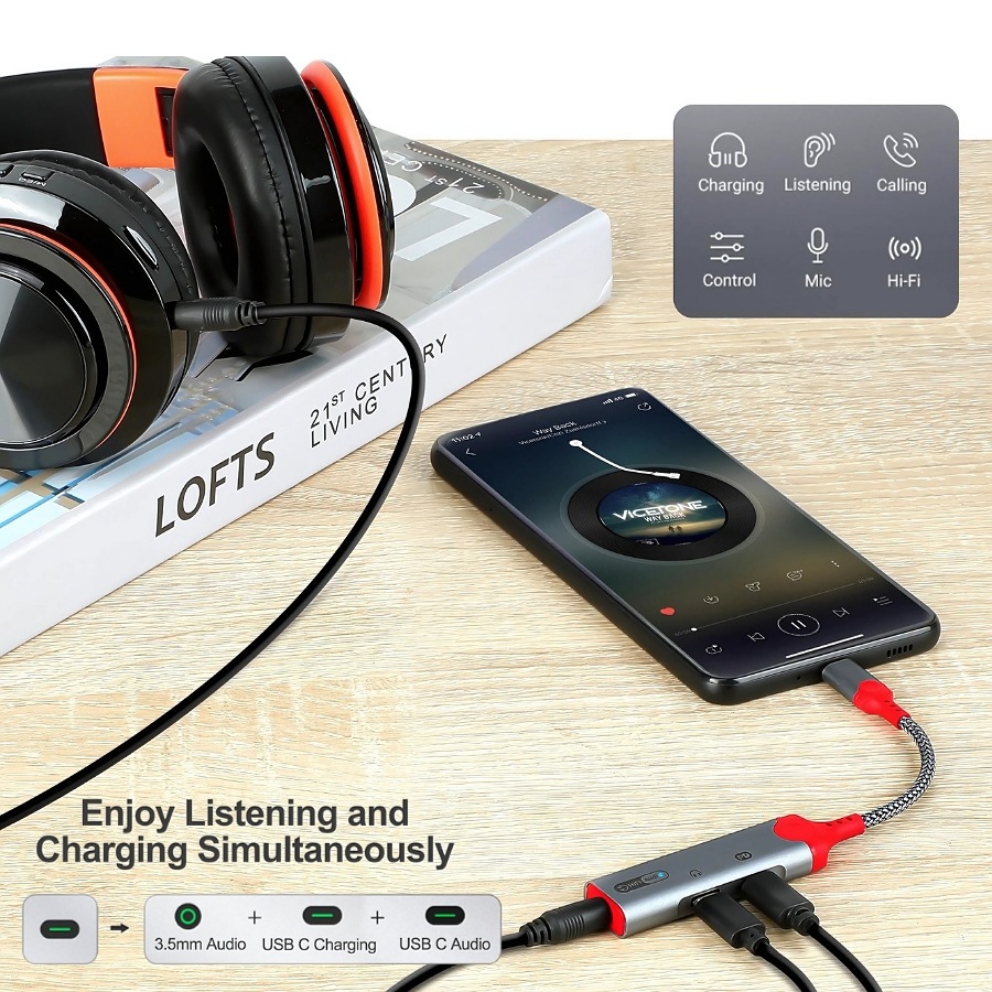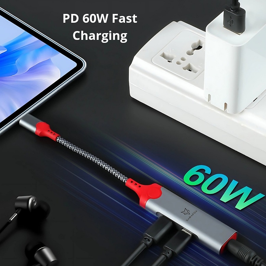 Sarafox 3 in 1 adapter, 60W charging port, 3.5mm headphone jack and Type-C port for headphones or external accessories, lightweight and easy to carry, compatible with most devices, suitable for normal use or gaming, offers a range of sound improvement, and the ability to use all ports at the same time.