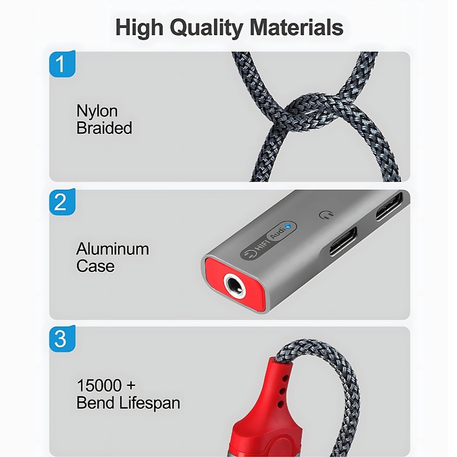•Type-C to HiFi Aux Adapter Converter Cable + Fast Charging